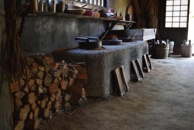 土間は、屋内にありながら土足で使える空間です。昔は農家で、農作業後の休憩や道具・収穫物の保管、炊事場などに活用されていました。屋根付きで雨風を防げるため、仕事と生活をつなぐ重要な場でした。