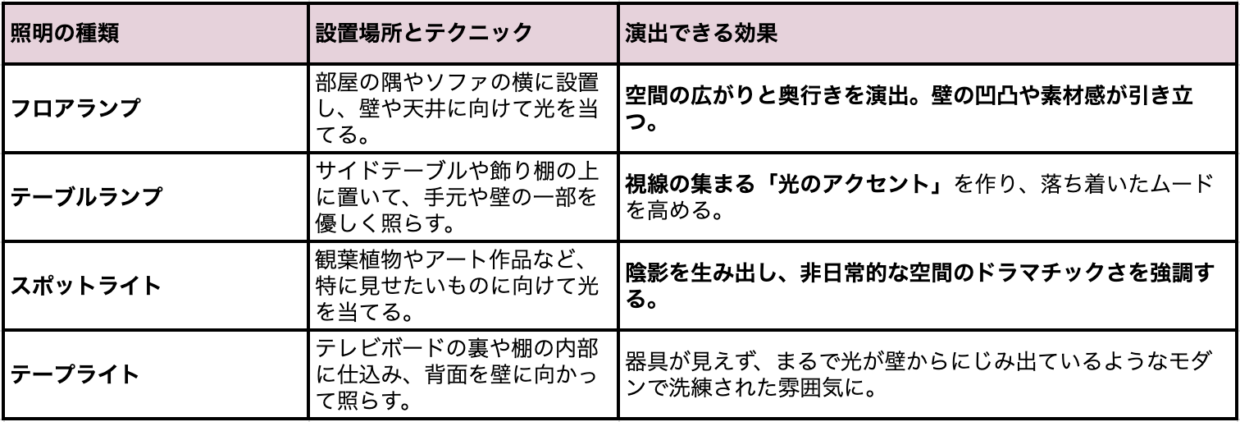 一つの照明で部屋全体を均一に照らすのではなく、複数の間接照明を組み合わせて、光に高低差と方向性を与えることで、