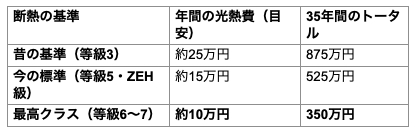 表を見てわかる通り、昔の基準の家と最高クラスの家では、年間で15万円、
