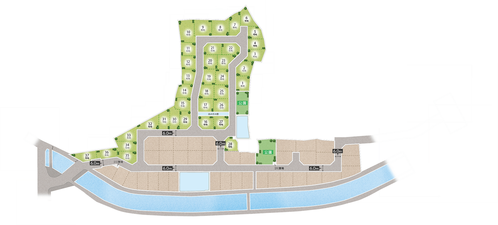タウン内道路は6m以上で、見通しの良さや、車の出し入れのしやすさに配慮。部外車両が通り抜けしにくい道路設計で、安心して歩けます。2つのタウン内公園も配置しました。