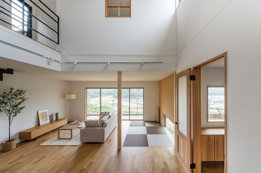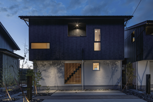 京都府南部、京田辺市の住宅地に建つ5戸の分譲住宅である。通常の住戸計画では日当たりの良い南側に住戸を開くが、本計画では眺望の良い北側に積極的に開く住戸計画とした。住戸プランに多様性を持たせるため、5住戸を3つの住戸パターンに分けた。どの住戸も眺望の良い北側の景観を取り込みながら、居住性高い分譲住宅に仕上がった。