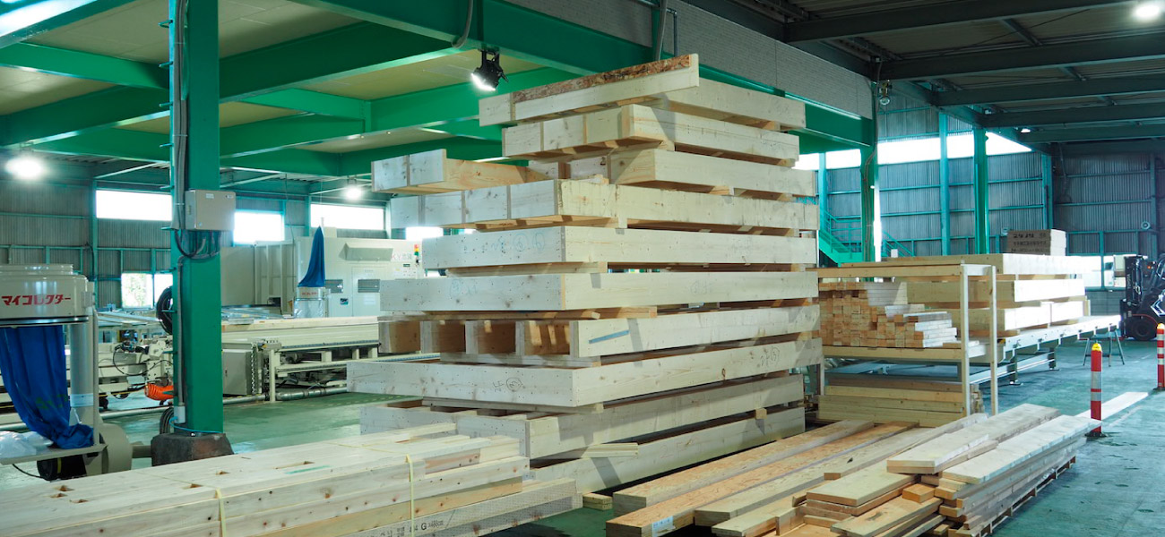 約2,800㎡の広大な面積を誇る、自社のプレカット工場にて、外壁のプレカットから在来軸組住宅、2×4住宅などの建材に使われる材料を、自社であらかじめ機械で加工し、強く美しい建材を提供しています。