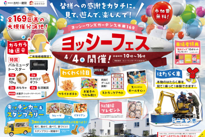 2026年03月24日 TOPICS 2026年03月24日 【4/4(土)開催】大型分譲地「ヨッシーワンズガーデン久米田169」にてヨッシーフェス開催!ガラガラ抽選会やキッチンカーも! 皆様への感謝をカタチに! 岸和田市田治米町の全169区画の大規模分譲地「ヨッシーワンズガーデン久米田169」にて、 ご家族みんなで楽しめる『ヨッシーフェス』を開催いたします。 ★ お楽しみコンテンツ ★ ⚫︎ハズレなし! […] 皆様への感謝をカタチに! 岸和田市田治米町の全169区画の大規模分譲地「ヨッシーワンズガーデン久米田169」にて、 ご家族みんなで楽しめる『ヨッシーフェス』を開催いたします。 ★ お楽しみコンテンツ ★ ⚫︎ハズレなし! […] 2025年12月26日 TOPICS 2025年12月26日 年末年始休業のお知らせ 平素より、吉村一建設をご愛顧いただき、誠にありがとうございます。 誠に勝手ながら、以下の期間を年末年始の休業期間とさせていただきます。 休業期間:2025年12月28日(日)~ 2026年1月4日(日) 12月27日( […] 平素より、吉村一建設をご愛顧いただき、誠にありがとうございます。 誠に勝手ながら、以下の期間を年末年始の休業期間とさせていただきます。 休業期間:2025年12月28日(日)~ 2026年1月4日(日) 12月27日( […] 2025年12月22日 TOPICS 2025年12月22日 2026/1/10 西宮住宅展示場オープンです!! 【西宮住宅展示場】が完成しました! 暮らしのイメージが広がる3棟のモデルハウスです。 モダン・ナチュラル・カジュアル、様々なテイストのモデルハウスになっており、 間取りにも様々な特徴のある仕掛けがされていて、じっくり見て […] 【西宮住宅展示場】が完成しました! 暮らしのイメージが広がる3棟のモデルハウスです。 モダン・ナチュラル・カジュアル、様々なテイストのモデルハウスになっており、 間取りにも様々な特徴のある仕掛けがされていて、じっくり見て […] 2025年10月15日 TOPICS 2025年10月15日 「グッドデザイン賞2025」を受賞しました! この度「ヨッシーワンズガーデン同志社山手フェバリエ」が『2025年度グッドデザインアワード』においてグッドデザイン賞を受賞しました。 グッドデザイン賞とは 1957 年創設のグッドデザイン商品選定制度を継承する、日本を代 […] この度「ヨッシーワンズガーデン同志社山手フェバリエ」が『2025年度グッドデザインアワード』においてグッドデザイン賞を受賞しました。 グッドデザイン賞とは 1957 年創設のグッドデザイン商品選定制度を継承する、日本を代 […] 2025年09月01日 TOPICS 2025年09月01日 新規分譲開始 こんにちは、吉村一建設です。 【ヨッシーワンズガーデン熊取つばさヶ丘】が、新規分譲開始致しました。 分譲地情報も更新されております。ぜひご確認ください^^ https://tsubasagaoka.yossy-ones- […] こんにちは、吉村一建設です。 【ヨッシーワンズガーデン熊取つばさヶ丘】が、新規分譲開始致しました。 分譲地情報も更新されております。ぜひご確認ください^^ https://tsubasagaoka.yossy-ones- […] 2025年07月25日 TOPICS 2025年07月25日 完売御礼 当社分譲地の【ヨッシーワンズガーデン野洲上屋】が完売致しました。 当分譲地は、全12区画の分譲地でした。  ご購入いただきました皆様の素敵な暮らし、輝く未来を願っております。 建築、住宅購入は、是非吉村一建設にご相談く […] 当社分譲地の【ヨッシーワンズガーデン野洲上屋】が完売致しました。 当分譲地は、全12区画の分譲地でした。  ご購入いただきました皆様の素敵な暮らし、輝く未来を願っております。 建築、住宅購入は、是非吉村一建設にご相談く […] 2025年06月28日 TOPICS 2025年06月28日 完売御礼 完売御礼 当社分譲地の【ヨッシーワンズガーデン太子町】が完売致しました。 当分譲地は、全32区画の分譲地でした。 ご購入いただきました皆様の素敵な暮らし、輝く未来を願っております。 建築、住宅購入は、是非吉村一建設にご相 […] 完売御礼 当社分譲地の【ヨッシーワンズガーデン太子町】が完売致しました。 当分譲地は、全32区画の分譲地でした。 ご購入いただきました皆様の素敵な暮らし、輝く未来を願っております。 建築、住宅購入は、是非吉村一建設にご相 […] 2025年05月20日 TOPICS 2025年05月20日 モデルハウスが完成しました! 【ヨッシーワンズガーデン東岸和田】 モデルハウスが完成しました! 見学可!是非ご覧ください。 【分譲地の魅力】 全9区画 全区画30坪以上 全区画約30坪以上のゆったりした土地だからこそ、庭や趣味部屋などお客様の暮らし方 […] 【ヨッシーワンズガーデン東岸和田】 モデルハウスが完成しました! 見学可!是非ご覧ください。 【分譲地の魅力】 全9区画 全区画30坪以上 全区画約30坪以上のゆったりした土地だからこそ、庭や趣味部屋などお客様の暮らし方 […] 2025年04月01日 TOPICS 2025年04月01日 友藤忠昭 代表取締役就任のお知らせ 2025年4月1日 友藤忠昭(弊社前専務)が代表取締役に就任致しました事をご報告いたします。 新体制になり、社員一同、取引先の皆様、地域社会の皆様との信頼関係を大切にしながら、 より一層、お客様